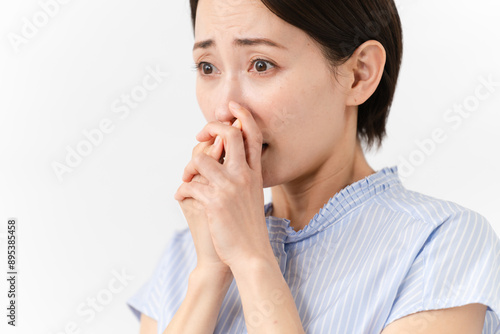 portrait, people, person, woman, woman, japanese, japan, asia, young, 30s, black hair, waist, shirt, sky blue, blue, blue, trend, surprised, amazed, surprised, negative, smile, front, clean, lovely, pretty, white background, indoor, indoor