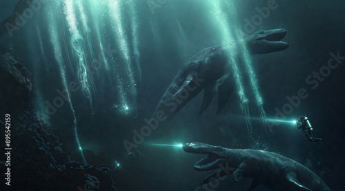 暗い深海を優雅に泳ぐプレシオサウルスのような巨大な海洋恐竜と、光るクラゲや謎めいた深海生物に囲まれ、ダイバーがその姿をカメラに収めた画像