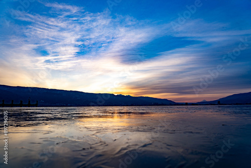 sunrise, morning sun, mountain, landscape, sky, nature, cloud, lake, water, sun, view