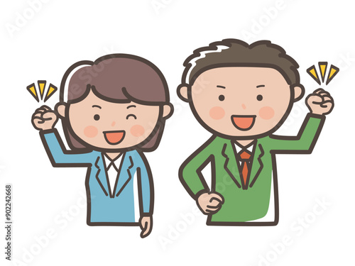 ガッツポーズでやる気満々の若い男女会社員の上半身イラスト