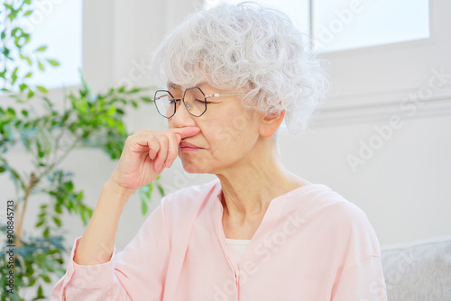 woman, aged, rhinitis, aged, snot, hay fever, living room, nose, rub, touch, cold, aged, home, room, elder, house, 60's, grandmother, indoor, indoor, japanese, asian