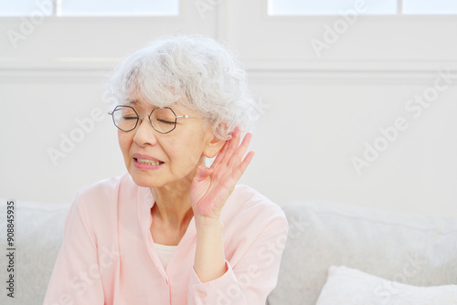 woman, aged, aged, living room, 60's, aged, home, pose, hear, room, elder, house, grandmother, indoor, indoor, ear, hand, gesture, japanese, asian