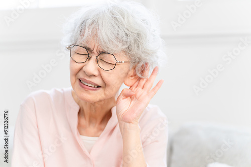 portrait, people, person, woman, woman, japanese, japan, asia, aged, aged, aged, 50's, 60's, knit, pastel colour, glasses, ear, hearing, hearing, hearing aid, health, poor health, injury, marode, negative, stern, arduous, painful, couch, window, houseplant, white background, indoor, indoor