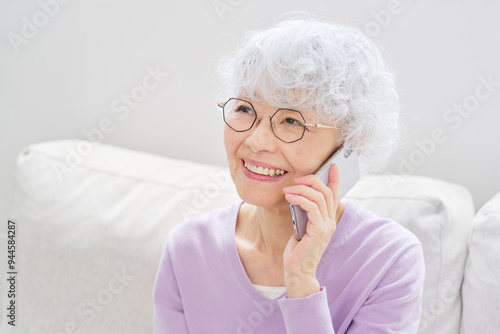 スマートフォンで電話するシニア女性 リビングルーム