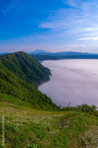 雲海に覆われた山間の湖の朝。美しく雄大な自然の明媚。北海道の摩周湖。