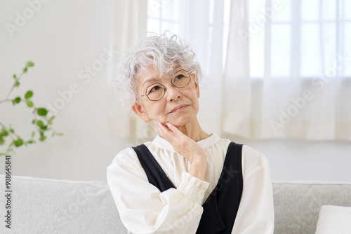 aged, woman, contemplate, hesitate, aged, home, house, elder, room, unrest, apprehension, couch, seated, 60's, aged, living room, indoor, grandmother, babushka, indoor, grandmother, nanny, people, japanese, asian