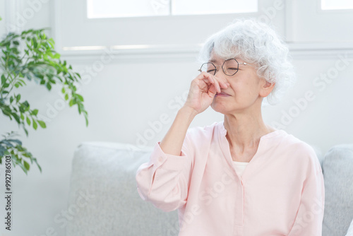 aged, aged, nose, snot, rhinitis, hay fever, 60's, japanese, asian, house, cold, sneeze, allergy, marode, fever, heat, flu, corona, virus, poor health, people, indoor, indoor, room, spicey, foul, couch, seated, elderly, sip, itchy, itch, itch, cry