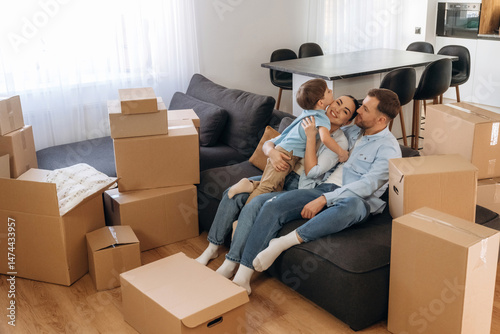 moving, family, husband, wife, son, new, house, rest, relax, home, domestic, room, anticipation, happy, three, people, male, female, young, children, children, boy, man, woman, adult, love, care, many, bunch, paper, box, object, modern, interior, owner, day, joy, achievement, goal, relationship, facial, expression, casual attire, clothes, wear, wall, background, together, caucasian