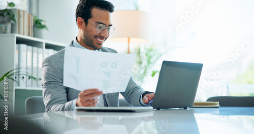 Finance, businessman or typing on laptop with paperwork for investment report or expenses review. Data analyst, smile or graph analysis of sales revenue, financial forecasting or growth chart at desk