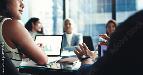 Finance, hands and laptop screen with business people in office boardroom for investment opportunity. Growth, portfolio and proposal with financial colleagues in workplace for wealth management
