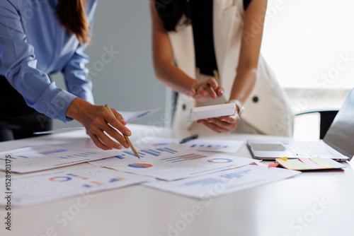 Financial analysts analyze business financial reports on a digital tablet planning investment project during a discussion at a meeting of corporate showing the results of their successful teamwork.