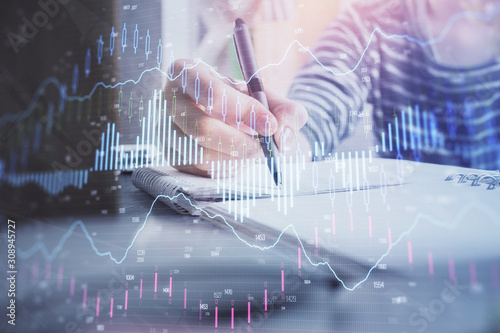 Financial forex graph drawn over hands taking notes background. Concept of research. Double exposure