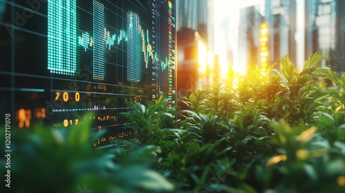 Financial Growth Illustrated Through Digital Graphs and Lush Greenery in a Vibrant Urban Setting at Sunset