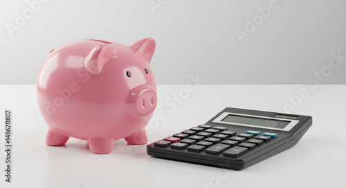 Financial Planning and Savings: Pink Piggy Bank and Calculator on White