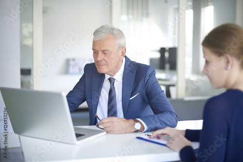 Financial team at work. Shot of a senior insurance agent consulting with her young client while sitting at office and working on laptop.