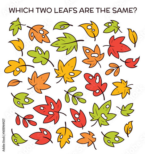 Find the Match. Autumn-themed visual puzzle for kids. Can you find the two identical leaves among many Great for observation, visual attention, and logic activities. Spot it.