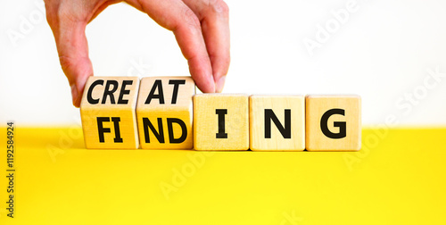 Finding or creating symbol. Businessman turns wooden cubes and changes words Finding to Creating. Beautiful yellow table white background copy space. Business creating or finding concept.