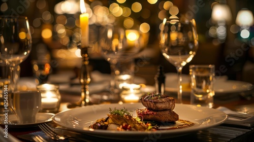 Fine dining experience with elegantly plated gourmet dishes, candlelit table setting, luxurious ambiance, highresolution culinary photography, Close up
