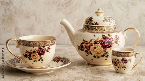 Fine vintage porcelain tea set with floral print and gold rim on cream table with space for text