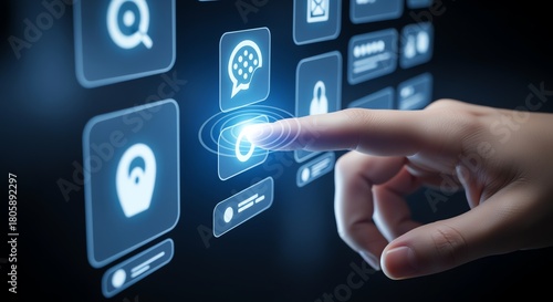 finger, touch, icon, interface, digital, technology, screen, glow, light, blue, dark, communication, search, electronic mail, security, password, message, app, application, buttons, select, choose, interact, connection, network, online, cyberspace, web, website, modern, futuristic, virtual, reality, datum, information, system, control, access, user, life events, design, graphic, symbol, signs, shape, rounded