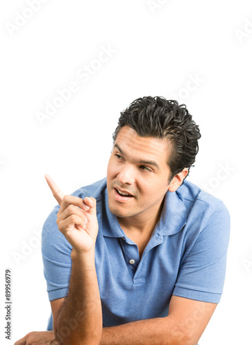 latino, male, pointing, space, empty, finger, hispanic, isolated, smiling, young, presenting, adult, advertisement, away, background, blank, blue, copy space, dark, dark hair, friendly, gesticulate, hair, photogenic, happy, imaginary, looking, looking away, looking up, man, minority, model, 1, portrait, shirt, resting, leaning, studio, 30s, vertical, white