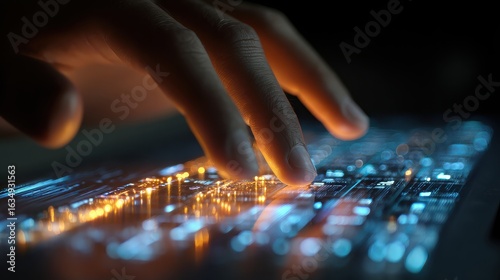 Finger touching glowing circuit board, technology and data connection