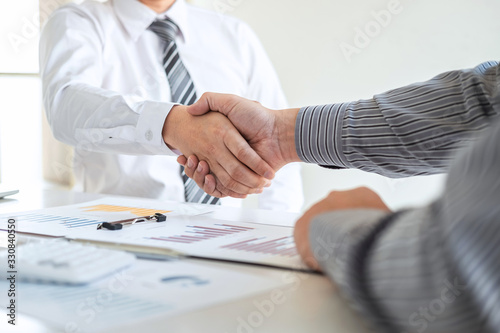 Finishing up a meeting collaboration, handshake of two business people after contract agreement to become a partner, collaborative teamwork