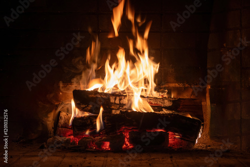 Fire burning in a fireplace, wood logs and flames. Warm home, heat. Christmas holiday