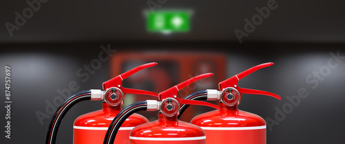 Fire extinguisher with door fire exit for prevent or protection or prepare fire equipment for prevention in emergency case and safety or rescue and alarm system training concept.