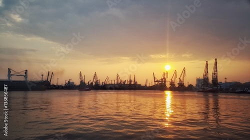 port, harbor, ship, shipping, varna, bulgaria, industrial, industry, transport, cargo, crane, crane, marin, sunset, sun, city, cloud, sky, horizon, nature, view, background, coast, coastal, dock, transportation, delivery, sunrise, dusk, silhouette