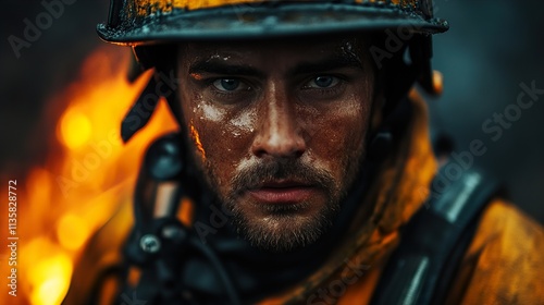 firefighter, fire, smoke, brave, courage, hero, emergency, rescue, danger, risk, protection, uniform, helmet, face, portrait, determined, strong, resilience, sharpened, intensity, grit, man, masculine, serious, confident, professional, duty, service, commitment, dedication, hard-working, exhausting, adrenalin, fearless, steely, gaze, intense, action, dramatic, closeup, detailed, realistic, dark, moody, fiery, burning, heat, hot