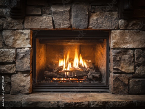 Fireplace Insert. Natural Gas Fire with Stone Surrounding Emitting Warm Glow