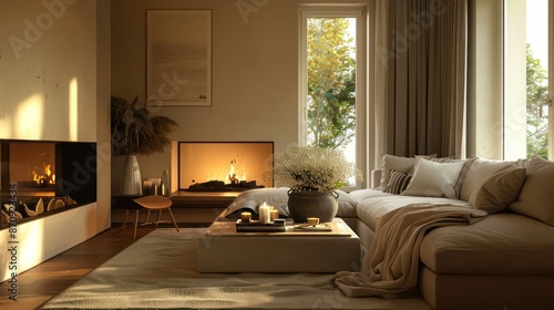Fireplace, light sofa, coffee table. Scandinavian style home interior design of modern living room