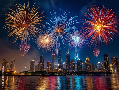 Fireworks above a city skyline, clear sky for business logos