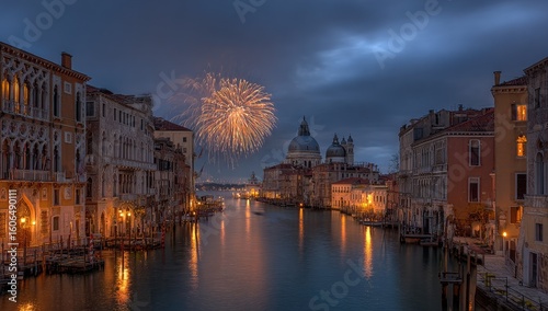 sky, classic, landscape, architecture, historic, picturesque, romantic, night, gold, grand, illuminated, view, light, waterway, charming, city, canal, elegant, europa, building, vibrant, beautiful, italy, light, cloud, celebration, fireworks, travel, scenic, water, evening, colourful, dusk, amazing, old
