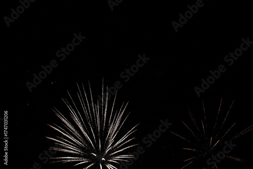 Fireworks on the dark sky background. Colorful fireworks. Abstract colored firework background with free space for text. fireworks light up the night sky. New year celebration fireworks