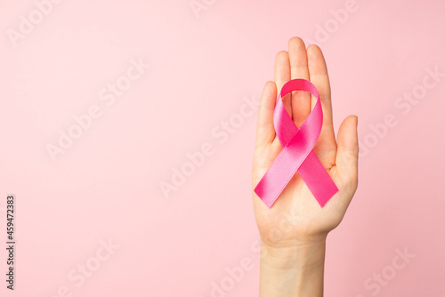 First person top view photo of hand holding pink ribbon in palm symbol of breast cancer awareness on isolated pastel pink background with empty space