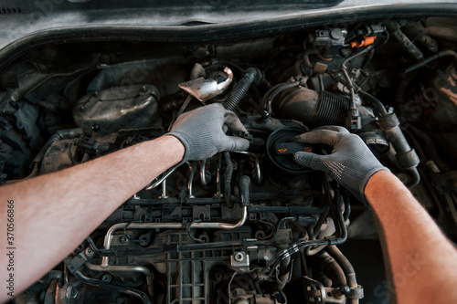 First person view of man's hands that repairs automobile. Conception of automobile service