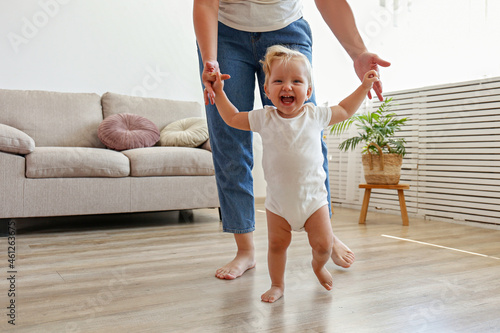 First steps of a little girl. A blond toddler learning to walk at home with the help of loving mother. Close up, copy space for text, background.