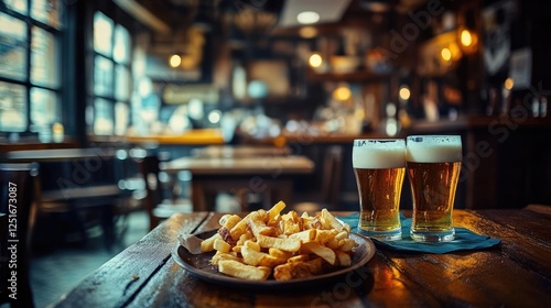 fish and chips, beer, pub, eatery, food, drink, bar, cosy, wooden table, brown, gold, fried food, comfort food, evening, night, relaxation, happy hour, tasty, delicious, appetising, food photography, closeup, traditional, relaxing, cheer, refreshment, comfort, social gathering, rustic, night time, warm tones, cold drink