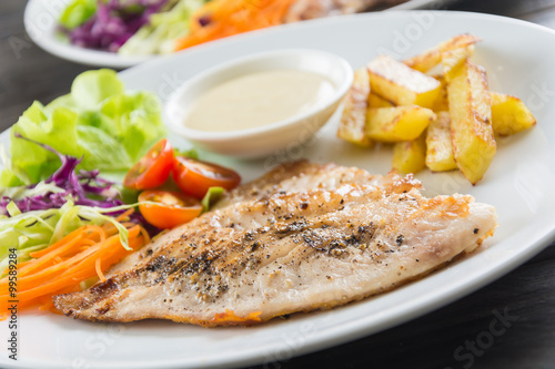 baked, bar-b-q, black, cooked, cookery, delicious, diet, dinner, dish, fillet, fish, food, fresh, fried, epicure, green, grilled, healthy, lemon, lunch, meal, omega, pepper, plate, prepared, red, eatery, salad, seafood, slice, steak, tasty, vegetable, vegetable