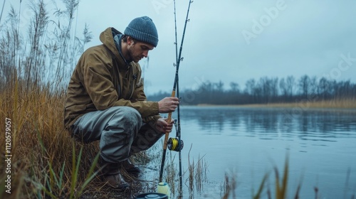 Fisherman kneeling near a fishing rod, organizing equipment by the water. generative ai