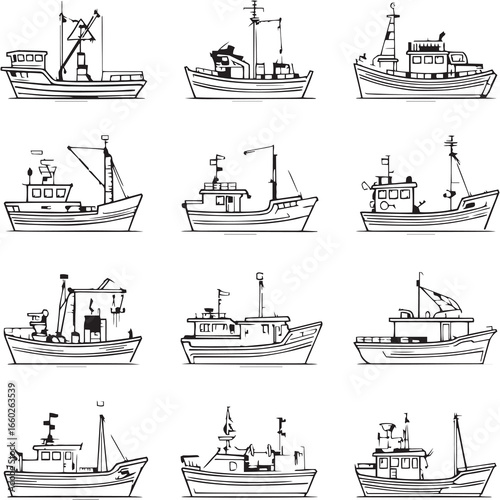 ship, boat, silhouette, vector, sea, icon, illustration, cargo, transportation, vessel, cruise, nautical, black, fishing, travel, transport, yacht, sailboat, ocean, sail, sailing, marin, symbol, water, set