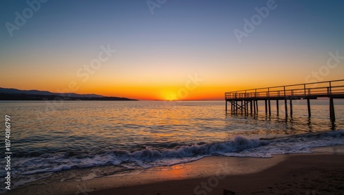 Fishing pier during sunset with vibrant sky, suitable for UI backdrop or design elements