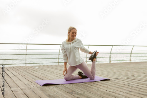 Fit blonde woman practicing leg stretching before outdoor workout. Young girl dressed in white hoodie trains on beach while sitting on mat. Healthy lifestyle, sports and fitness