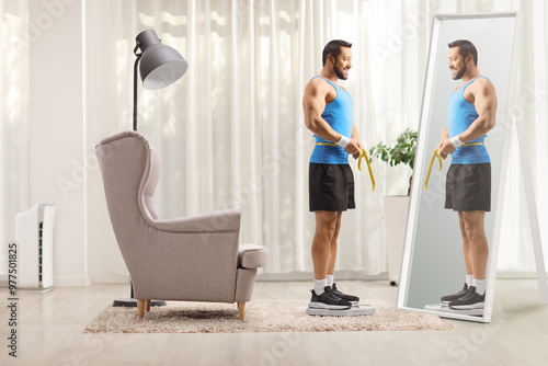 1, active, adult, background, bmi, body, exercise, fit, fitness, full, glasses, guy, happy, healthy, home, kg, length, lifestyle, look, male, man, measure, measuring, mirror, model, muscle, nourishment, 1, people, person, satisfied, scale, shape, short, smile, sport, activewear, sporty, standing, tape, trainer, training, vitality, waist, weight loss, well-being, wellness, physical exercise