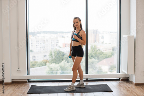 Fit young woman stands on yoga mat by large window, holding blue dumbbells, dressed in sportswear, looks ready for home workout session, illustrating determination, health, and wellness.