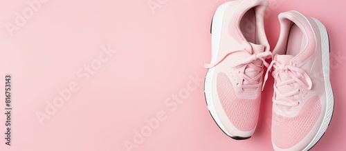 Fitness concept with female sneakers and sport shoes arranged in a flat lay on a pink background Perfect for running workouts sports and yoga Ample copy space for text