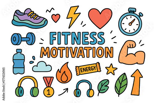 Fitness Icons Doodle. Fitness Motivation. Colorful Hand-drawn doodle Children illustration Fitness Motivation sneakers, lightning bolt, heart, stopwatch,