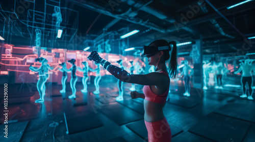 people, fitness, gym, virtual, person, hologram, holographic, physical exercise, exercise, training, athlete, indoor, futuristic, innovation, tech, cyberspace, entertainment, future, model, sport, goggles, device, health, female, male, cardio, interactive, woman, technology, reality, active, modern, body, lifestyle, digital, equipment, simulation, activewear, concept, adult, athletic, exercising, headset